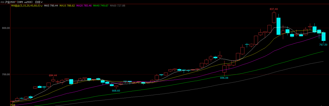 贵金属价格在上周冲高后再度回落,今日早盘大幅下行。截至下午收盘,沪金主力2508合约报772.28元/克,跌幅2.01%。